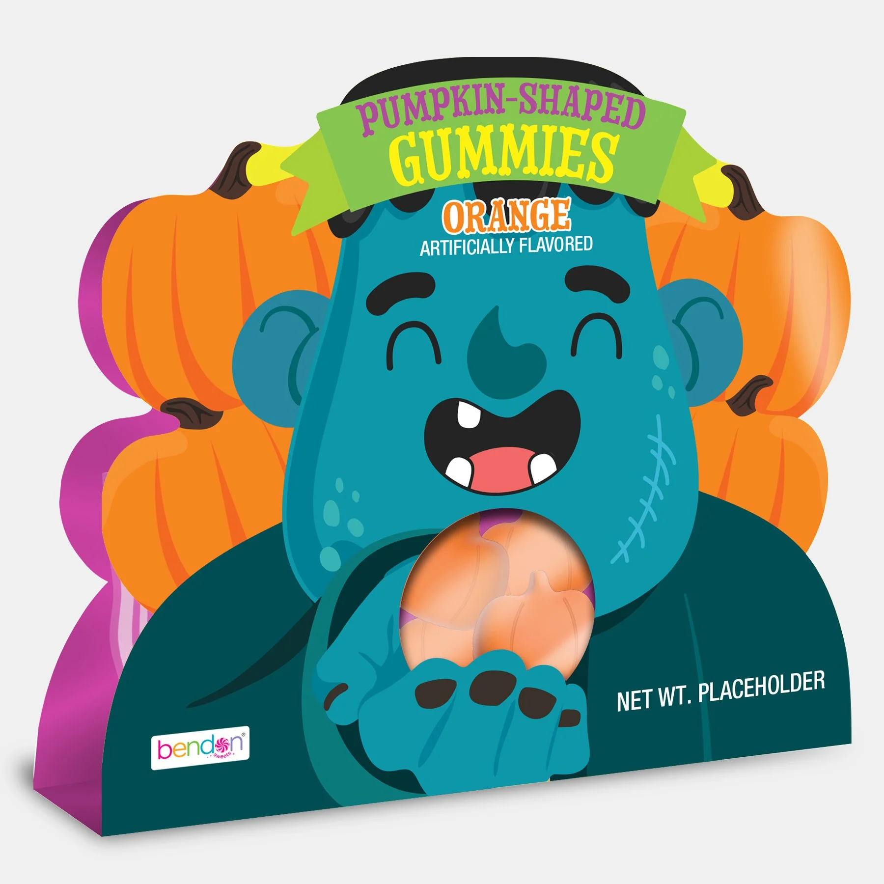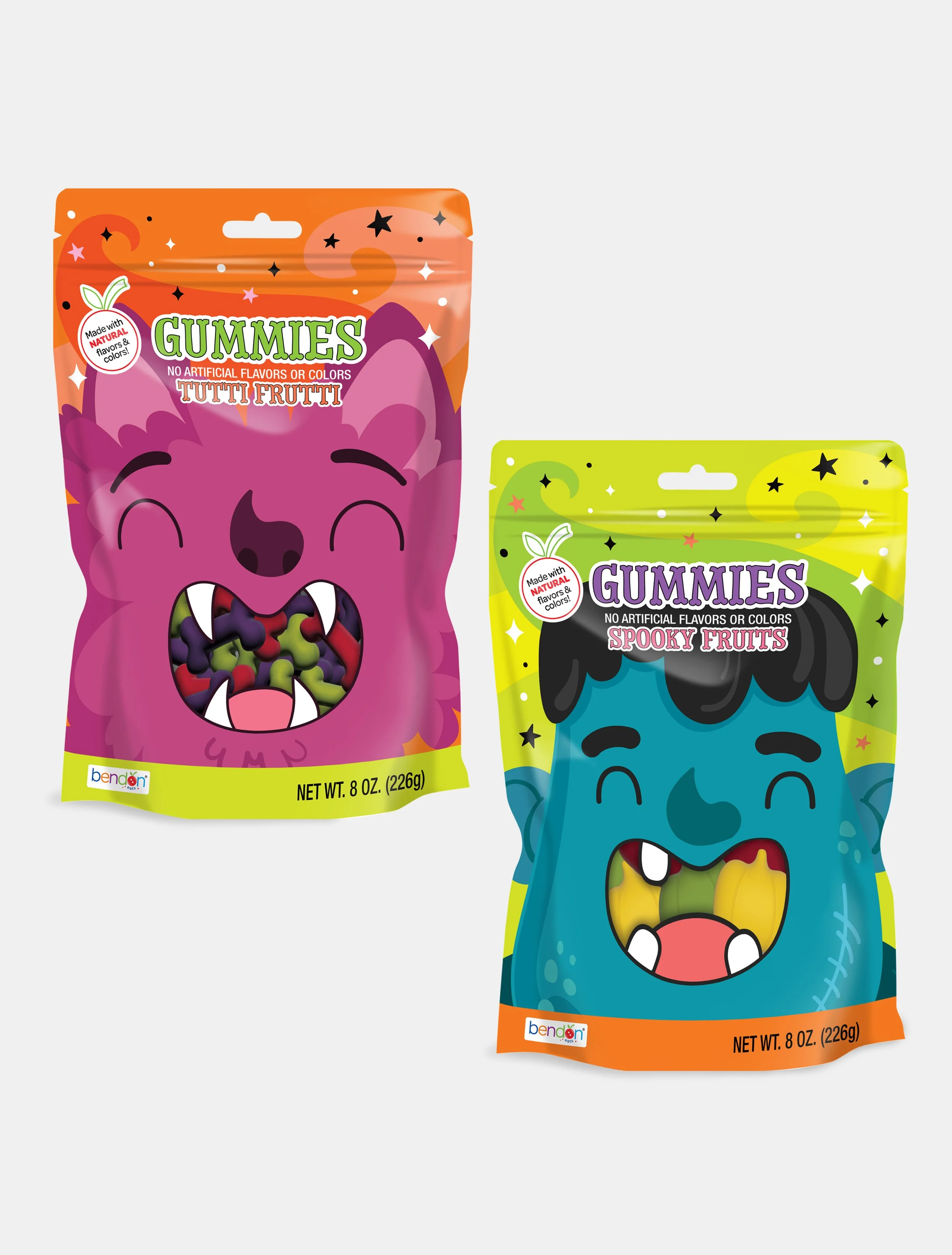 Concepts were created for Walmart’s Halloween Candy PDQ. Walmart requested fun and bright retro designs. Walmart sent us an inspirational PDF guide for reference. We provided both natural and artificial flavors for approval. Two packaging designs were offered: a bag and a shaped package, both with a die-cut window showcasing the gummies.